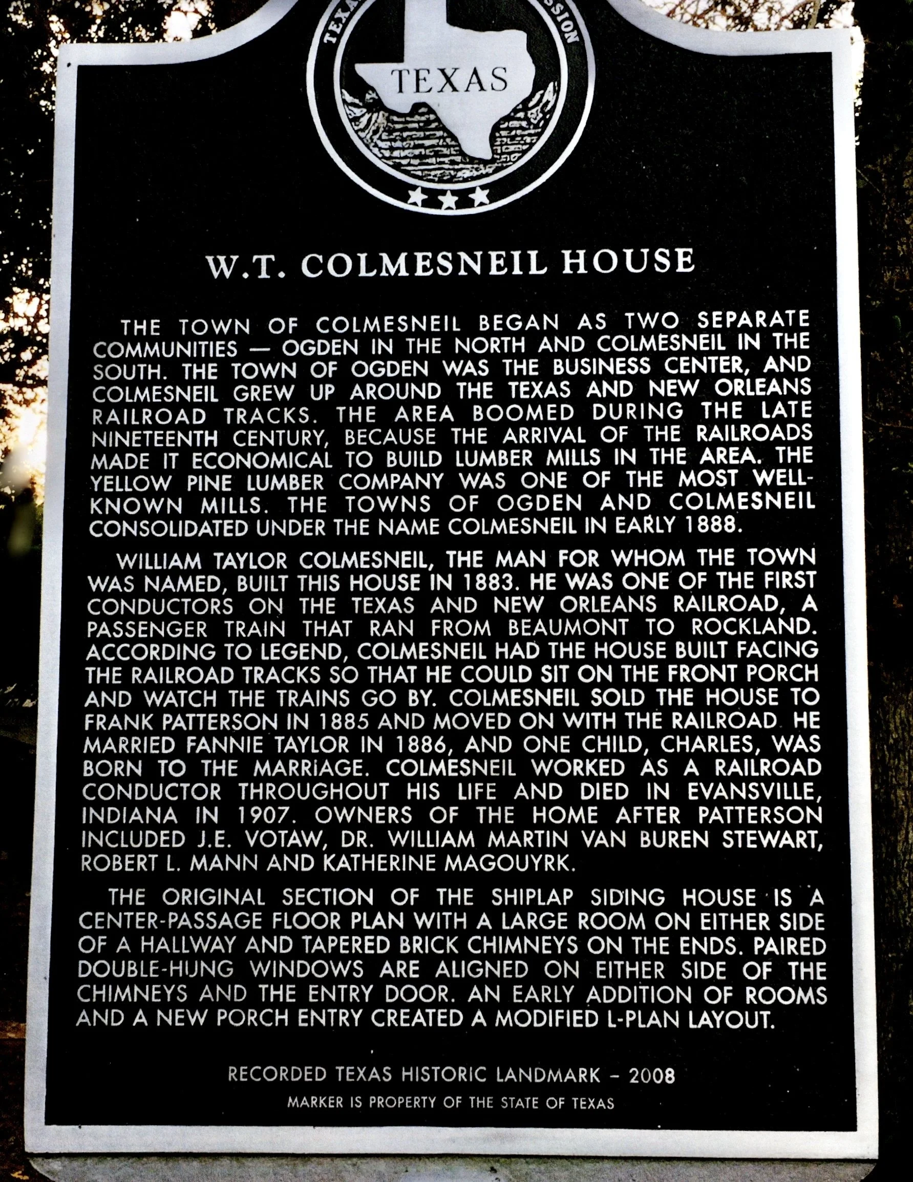 W.T. Colmesneil was the the conductor of the first railroad train to come through the area, and the man for whom the town of Colmesneil was named.
